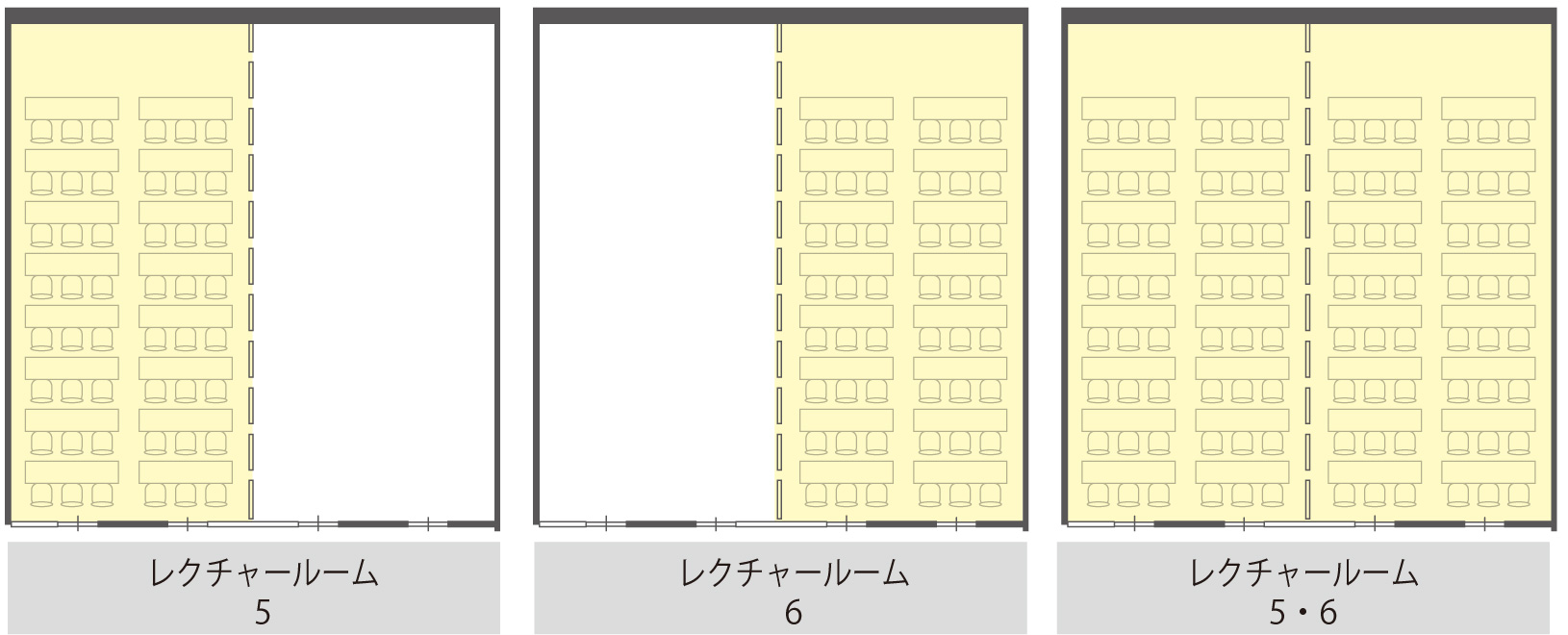 3つのお部屋は連結利用が可能となり、レクチャールーム5+6の連結利用時は、大会議室として最大96名までのご利用が可能となります。小会議室としては、24名までのご利用が可能。