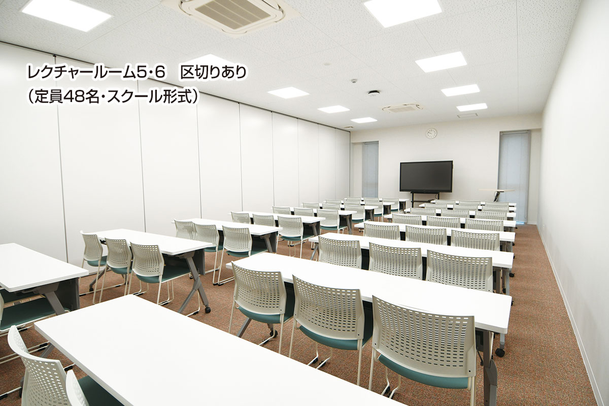 3つのお部屋は連結利用が可能となり、レクチャールーム5+6の連結利用時は、大会議室として最大96名までのご利用が可能となります。小会議室としては、24名までのご利用が可能。